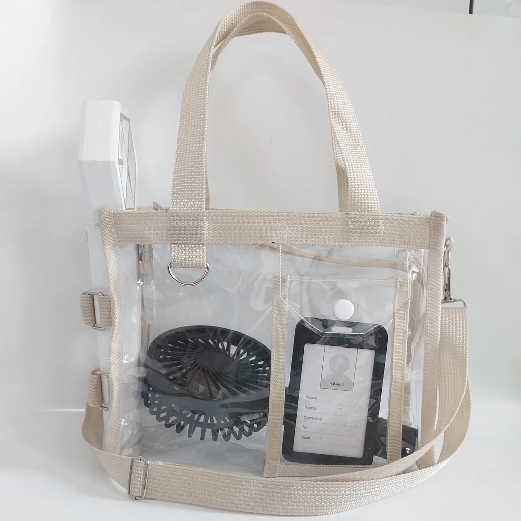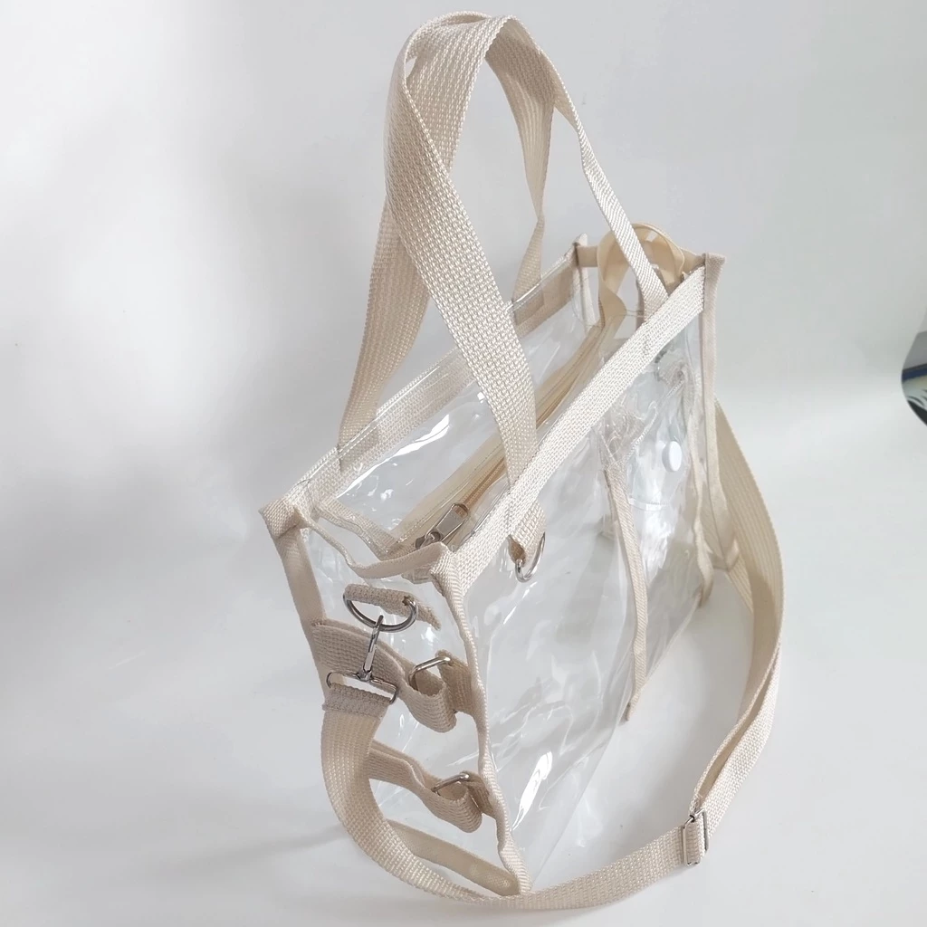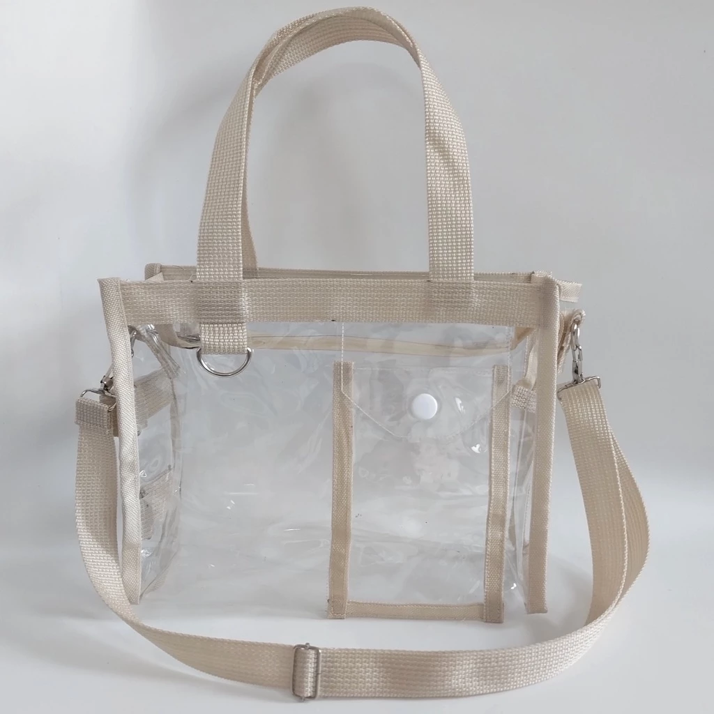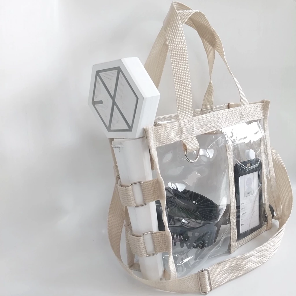 Tas multifungsi berwarna krem ini memiliki ukuran ideal dengan panjang 20 cm, lebar 10 cm, dan tinggi 25 cm, serta dilengkapi dengan tali yang dapat diatur sepanjang 120 cm. Terbuat dari bahan PVC tebal yang menjamin daya tahan, tas ini memiliki desain simple dengan jahitan rapi dan kuat. Fitur unggulan dari tas ini termasuk slot untuk lightstick atau kipas, serta slot tambahan untuk kartu, handphone, dan berbagai barang lainnya seperti tisu, biskuit, kosmetik, dan dompet. Bagian tas yang bening dilengkapi dengan penutup resleting, dan pengait tali selempangnya yang kuat memastikan keamanan barang bawaan Anda. Dengan kombinasi fungsi dan estetika, tas ini adalah pilihan sempurna untuk kebutuhan sehari-hari Anda.